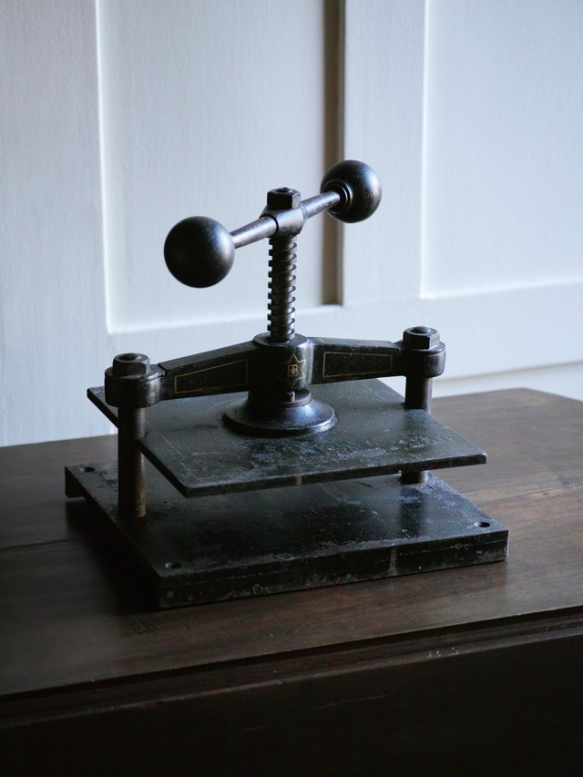 西洋の製本技術を支えたプレス機です。ドイツ製らしい精密で堅牢なつくりが特徴です。 Germany W335 D295 H320 mm