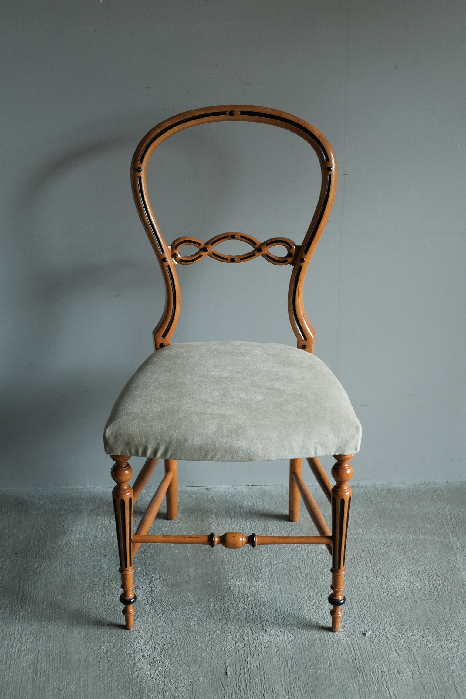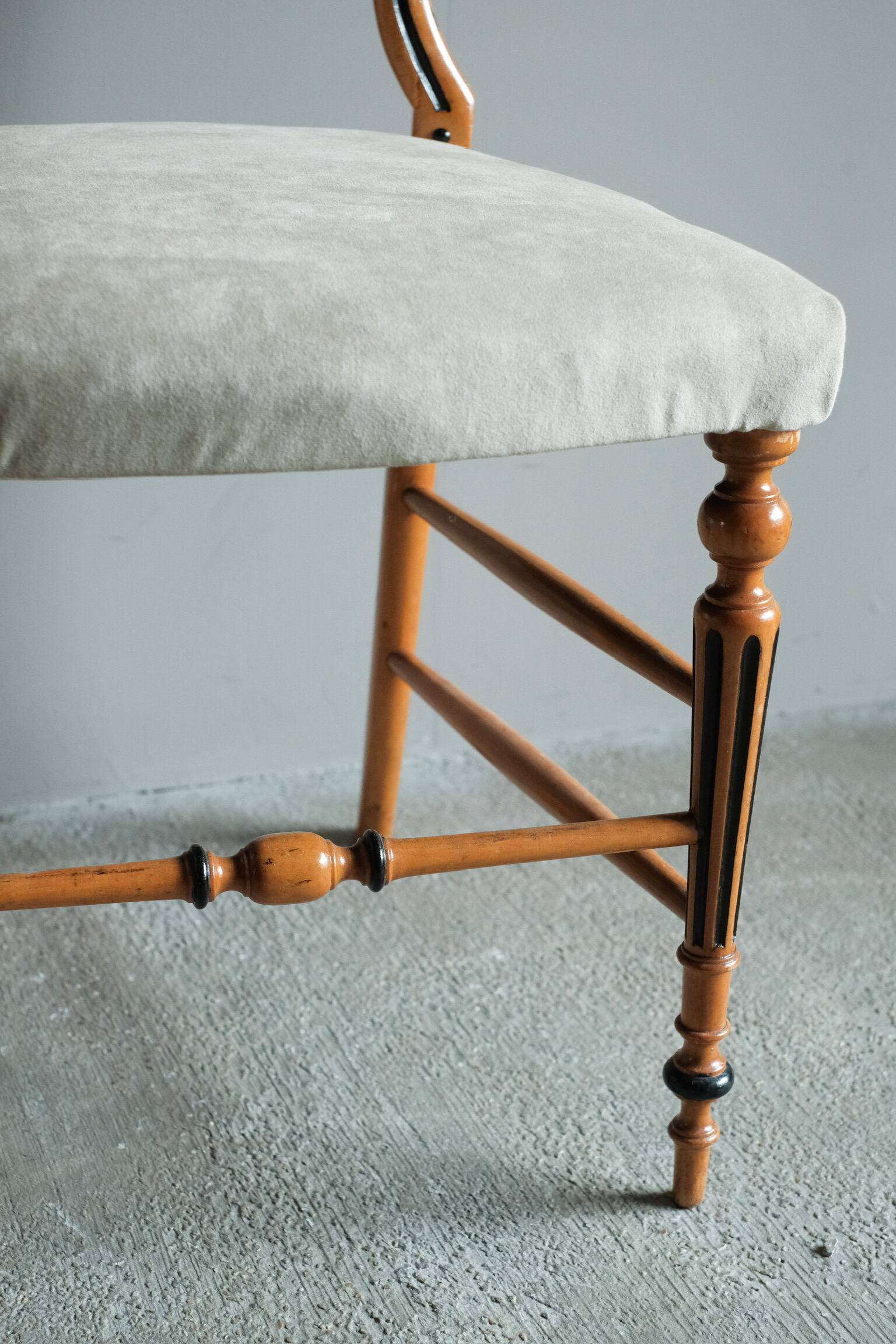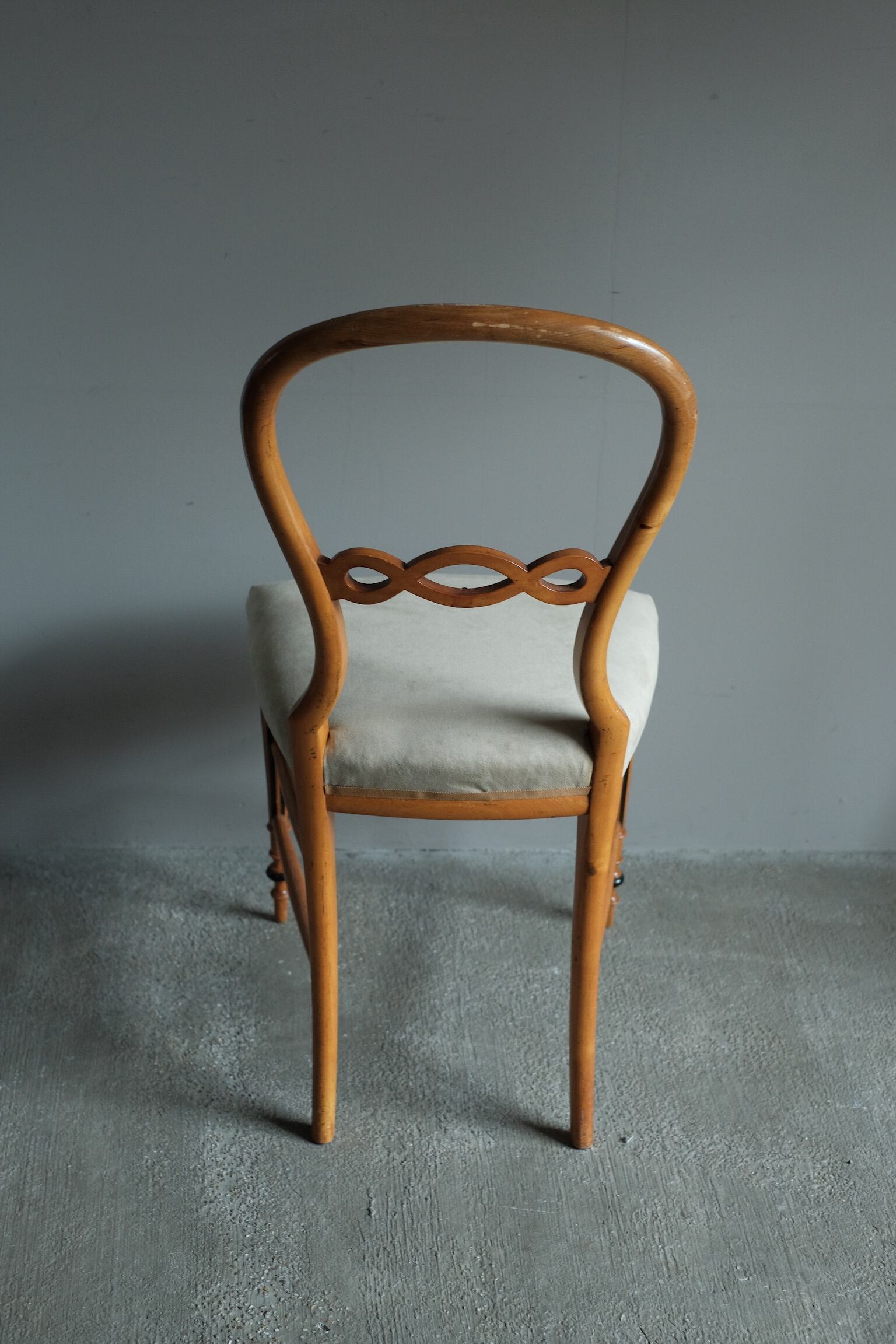 少し低めで曲線的なフォルムが特徴です。座面は肌触りの良い上質な生地に張り替えられています。