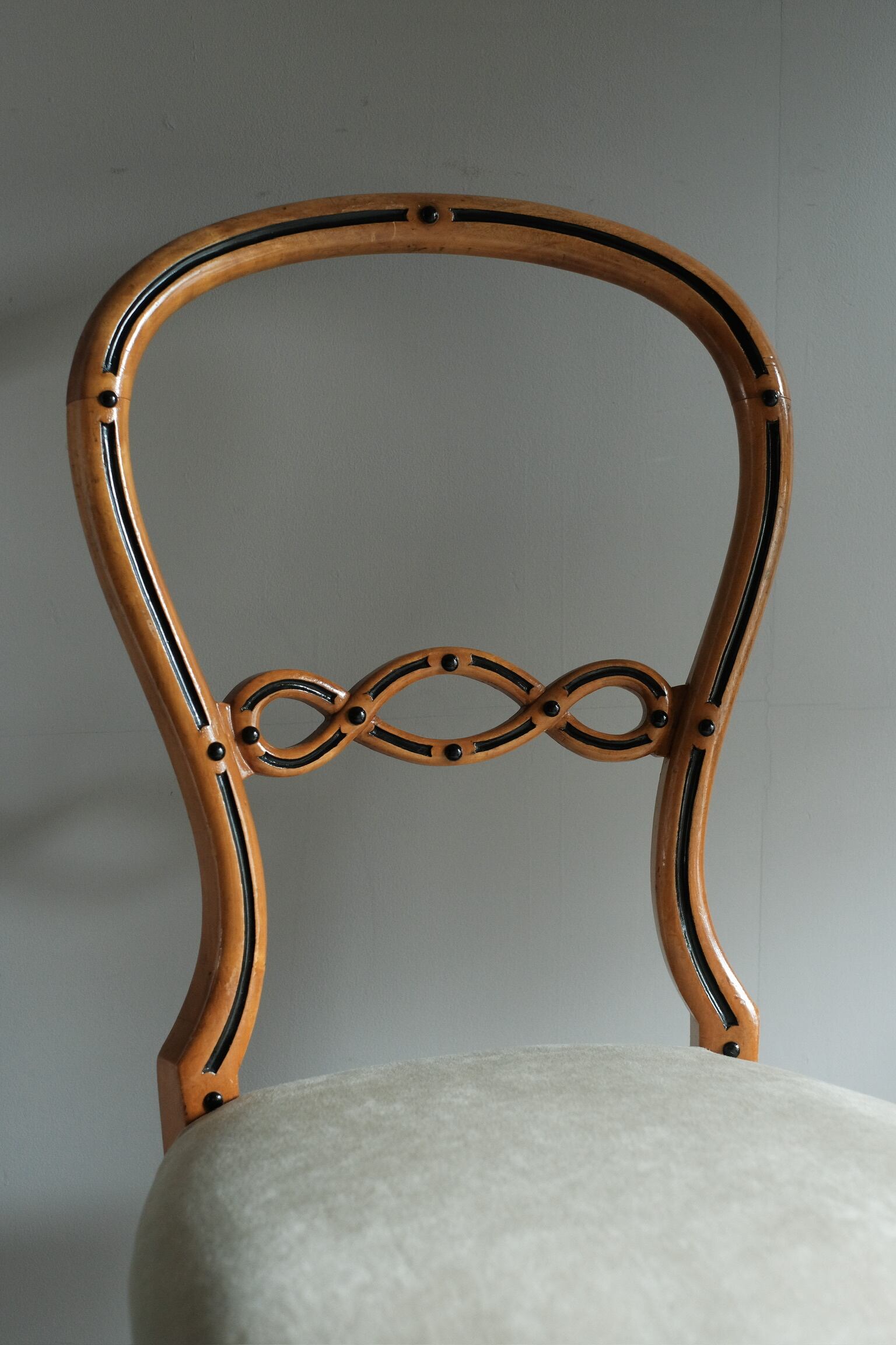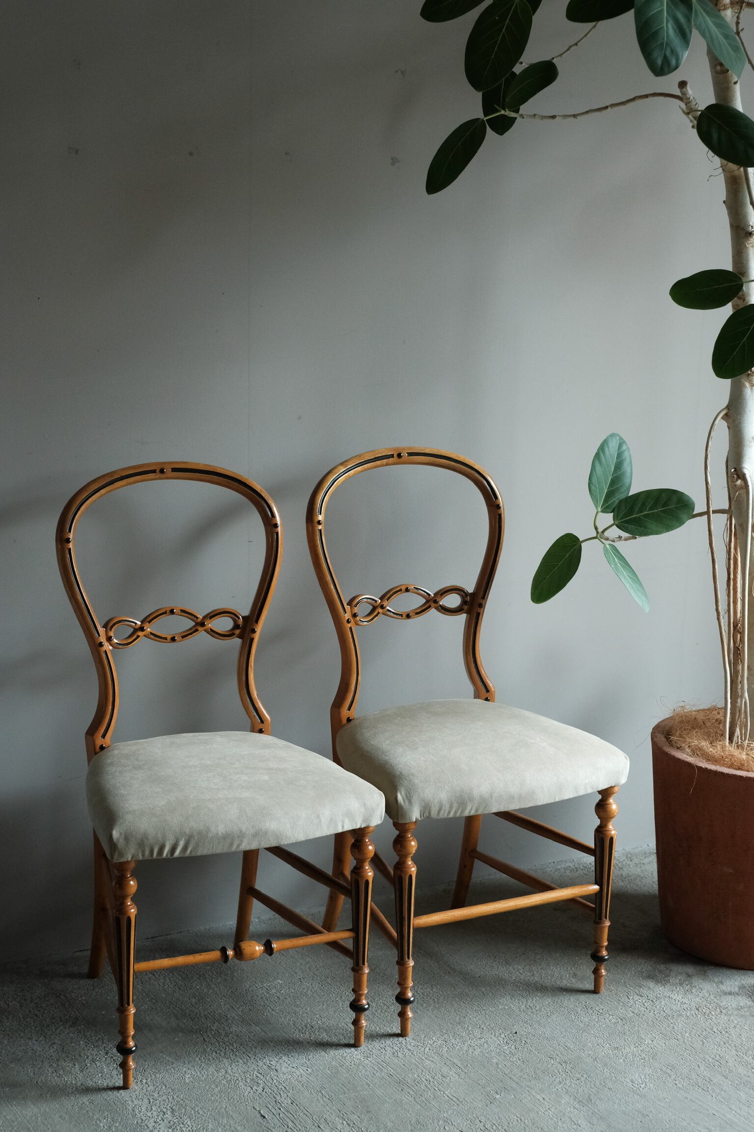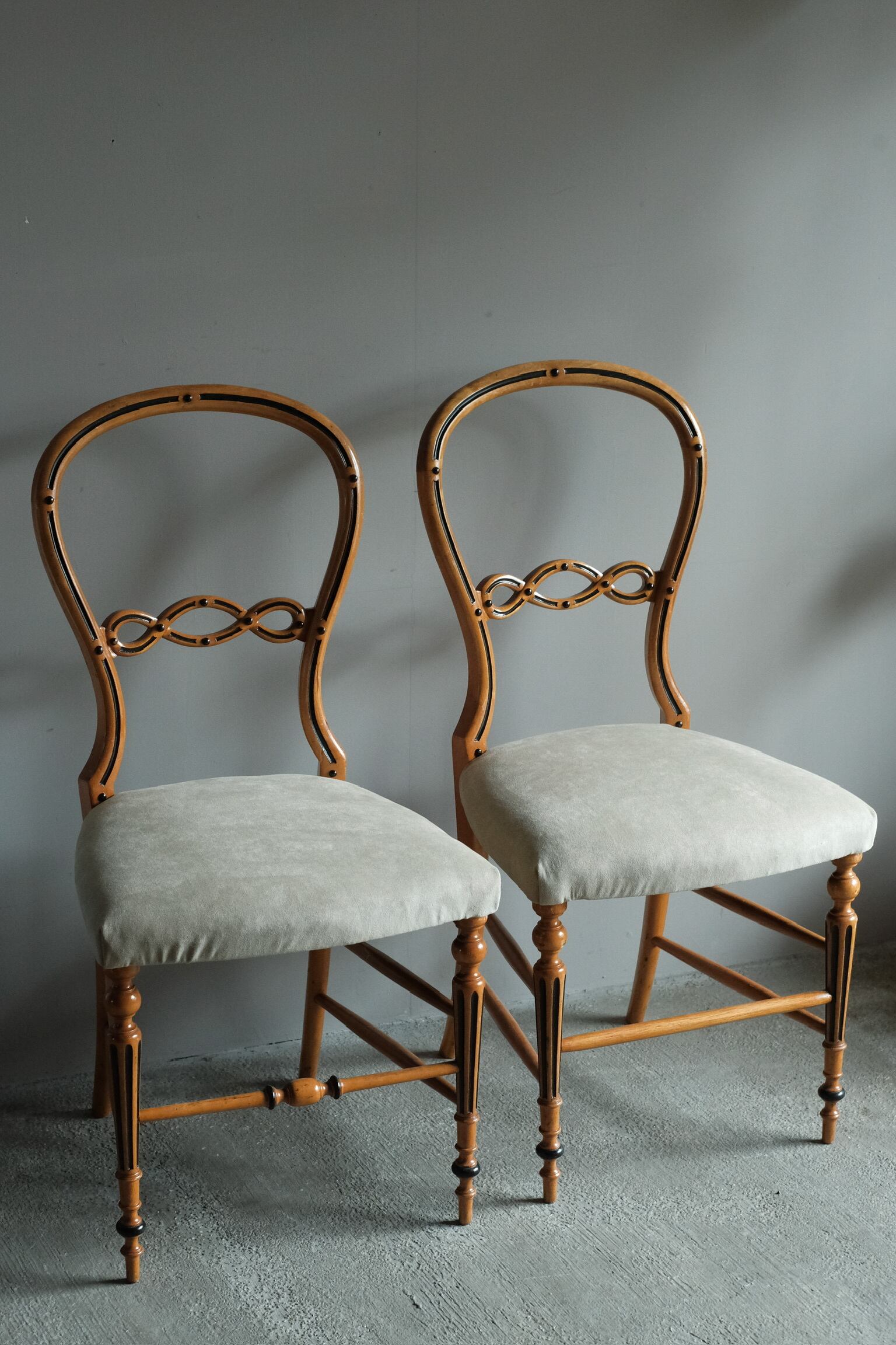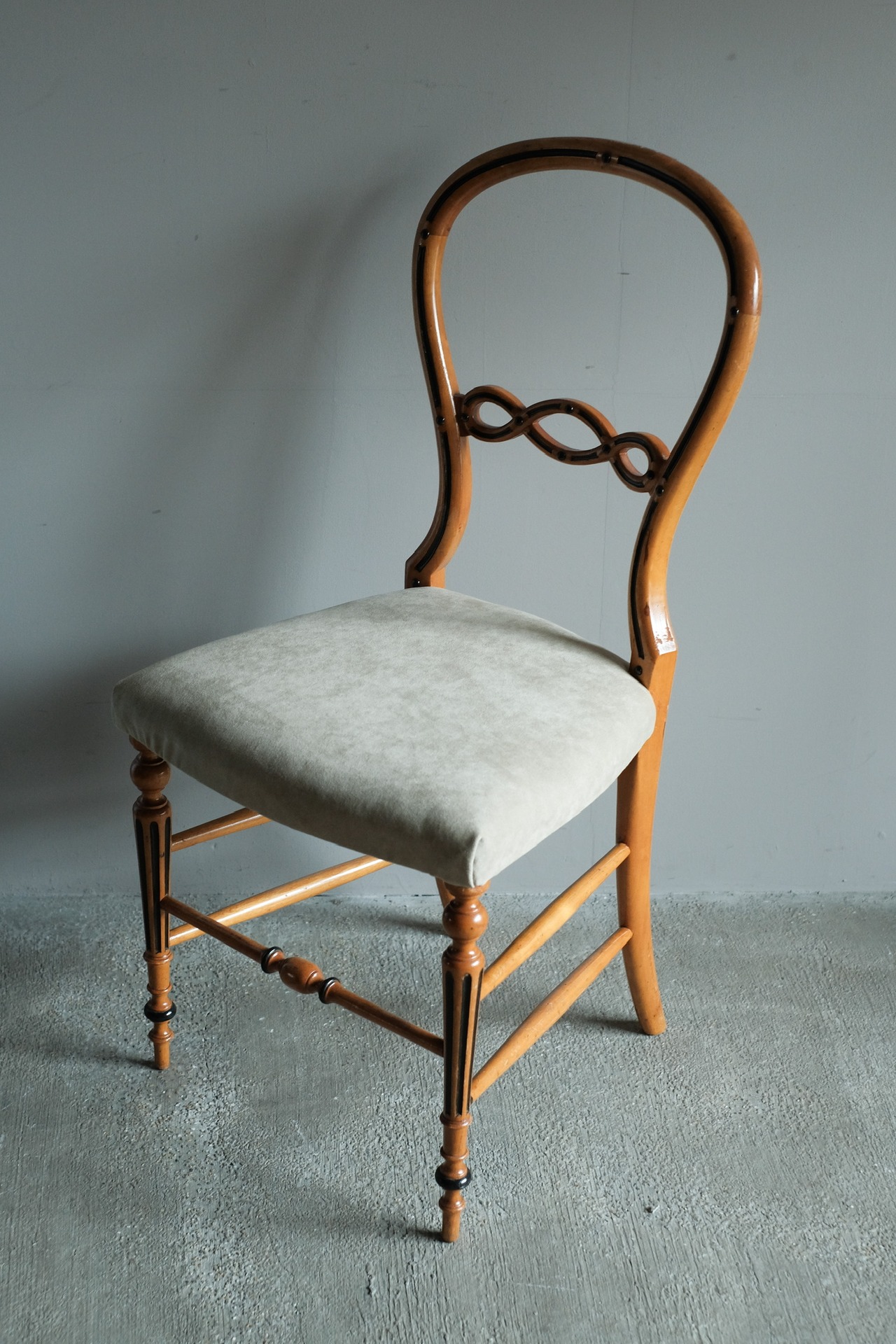 少し低めで曲線的なフォルムが特徴です。座面は肌触りの良い上質な生地に張り替えられています。