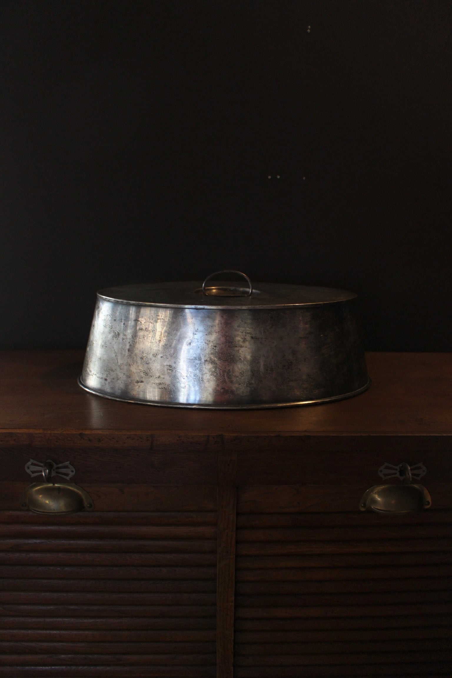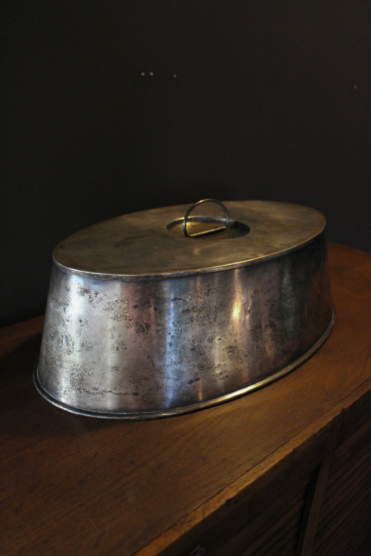 洋銀製のフードカバー。ピューターの大皿に盛られた肉料理などに被せて用いられ、香りを閉じ込めるとともに保温効果も果たします。